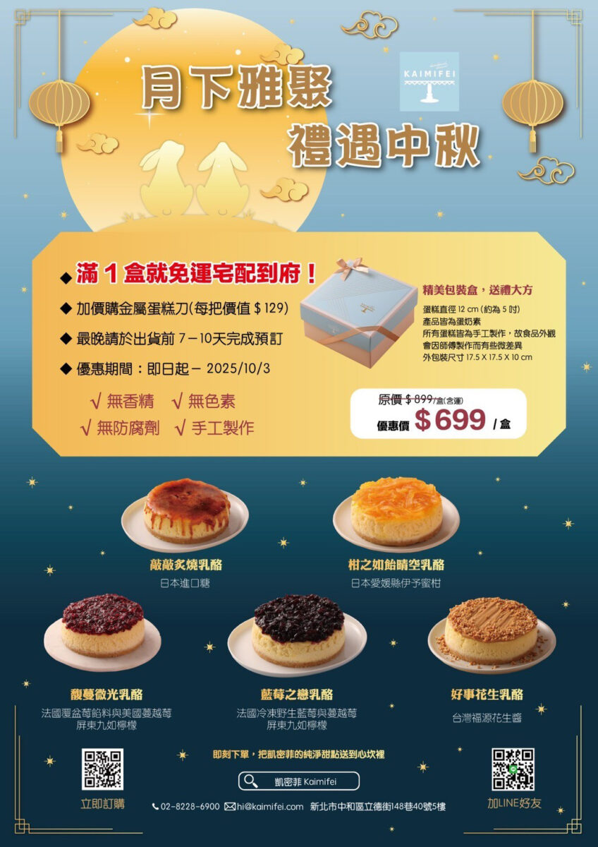 首頁 最新消息 🌝 月下雅聚.禮遇中秋限定 🌝 🌝 月下雅聚.禮遇中秋限定 🌝中秋,是一年中最溫柔的團聚時刻。 一輪滿月,映照著彼此的牽掛;一份禮物,承載著無聲的祝福。 🌝 月下雅聚.禮遇中秋限定 🌝 優惠期間:即日起 – 2025/10/3中秋佳節,不只是月圓團聚的日子,更是一個將心意化為禮物的時刻。在月光下,傳遞最細緻的心意。精緻的品味,獻給懂得生活的您! 🎁 中秋單盒優惠|只要 $699(原價899) 🎁✅ 滿1盒即可宅配免運✅ 滿12盒享團購價 再贈12把金屬蛋糕鏟🛒 馬上選購 👉點擊下單👈 📌 活動備註:・下單後新鮮製作,最晚請於 7~10 個工作天前完成預訂(可備註希望出貨日)・黑貓冷凍宅配到府・蛋糕皆為純手工製作,數量有限,售完為止! 好評推薦 cc Chianggoogle map 閱讀更多 乳酪真的非常非常好吃!超級激推,很少吃到這麼不膩口清爽的乳酪,但又保有濃郁香氣,到底怎麼辦到的~~~ rachel_eat_play@rachel_eat_play 閱讀更多 蛋糕表面的糖脆透亮~超誘人! 最下層為手工餅乾,上面是甜而不膩的經典乳酪蛋糕 最上層則是超吸睛的焦糖脆~ 等到解凍完成開始敲敲敲!可以用蛋糕鏟或湯匙敲裂~ 除了用蛋糕鏟切塊以外,也可以用湯匙慢慢挖慢慢享用 口感真的很讚!感受糖脆的焦香與輕柔滑順如冰淇淋般的乳酪 在口中慢慢化開來~對於像我一樣的烤布蕾愛好者,十分滿足! John Doe@username 閱讀更多 帶點焦香的口感真的超讚的😋 不複雜的口感卻可以品嚐到品牌用心的地方! 每一口都是最原味純粹的滋味 真的太幸福啦🥰 也很適合送給親朋好友呦~ 上一篇 下一篇 標籤# IG蛋糕推薦# 中秋節蛋糕# 中秋送禮# 中秋限定# 乳酪蛋糕推薦# 企業送禮# 敲敲炙燒乳酪# 福委推薦 -立即分享- 上一 文章 母親節蛋糕推薦|凱蜜菲純手作乳酪蛋糕,媽媽最想收到的甜點禮物
